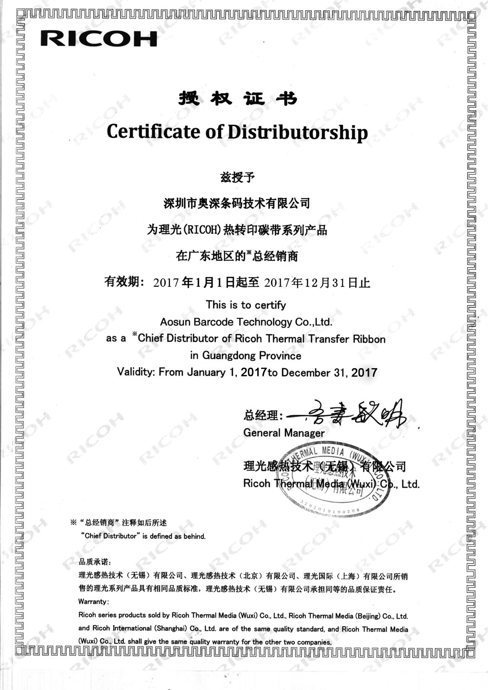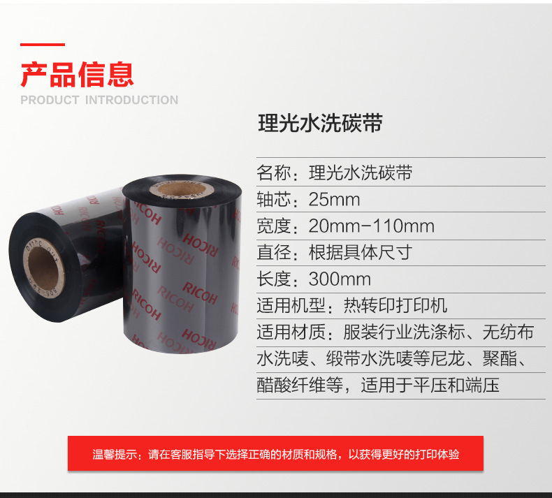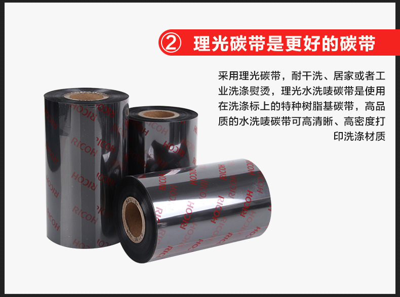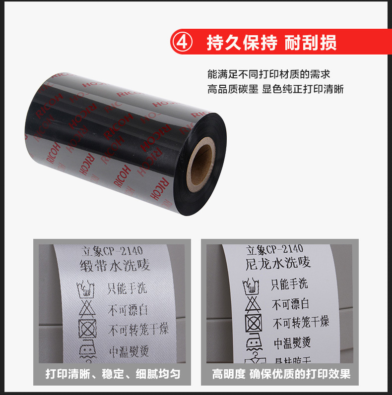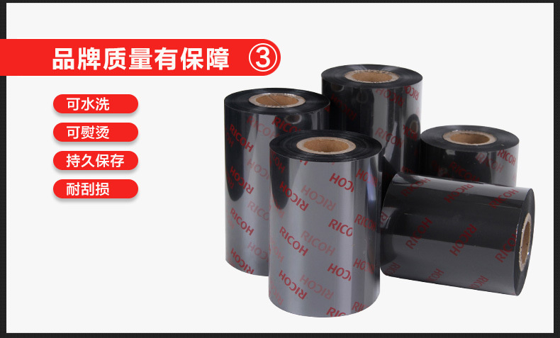 色帶系列材質(zhì)選擇顏色性能特點(diǎn):理光碳帶特點(diǎn):1、優(yōu)秀耐磨擦、耐腐蝕性能,具有廣泛的應(yīng)用領(lǐng)域。2、高度分辨率適合打印標(biāo)準(zhǔn)及旋轉(zhuǎn)條型碼。3、能滿足不同被打印材質(zhì)的需求。4、高敏感度確保優(yōu)異的打印效果。5、防靜電背涂層,有效保護(hù)打印頭。混合基產(chǎn)品顏色碳帶等級(jí)耐臟及耐熱性特性應(yīng)用B110A黑蠟與樹(shù)脂混合基50℃(