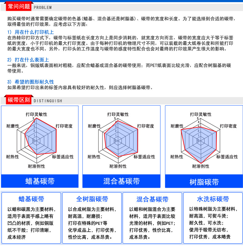 色帶系列材質(zhì)選擇顏色性能特點(diǎn):理光碳帶特點(diǎn):1、優(yōu)秀耐磨擦、耐腐蝕性能,具有廣泛的應(yīng)用領(lǐng)域。2、高度分辨率適合打印標(biāo)準(zhǔn)及旋轉(zhuǎn)條型碼。3、能滿足不同被打印材質(zhì)的需求。4、高敏感度確保優(yōu)異的打印效果。5、防靜電背涂層,有效保護(hù)打印頭?;旌匣a(chǎn)品顏色碳帶等級(jí)耐臟及耐熱性特性應(yīng)用B110A黑蠟與樹脂混合基50℃(
