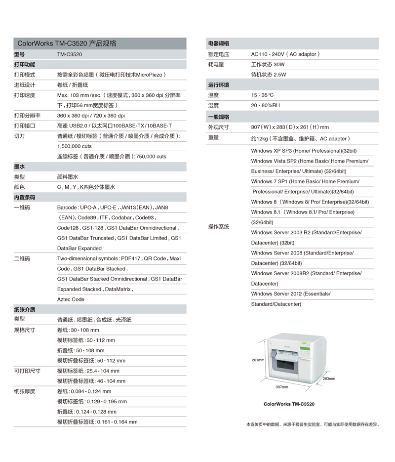 引領(lǐng)彩色標簽時代,全能打印解決方案TM-C3520作為愛普生彩色標簽領(lǐng)域的新一代產(chǎn)品,秉承愛普生微壓電打印技術(shù),再配以獨特的4色分體墨盒和自動切刀 設(shè)計,在提供用戶高質(zhì)量彩色標簽按需輸出的同時,有效降低TCO(綜合使用成本)。TM-C3520為化工行業(yè)、制造行業(yè)、鞋服類行業(yè)、零售行業(yè)等行業(yè)提供了高生產(chǎn)力,低 TCO&nb