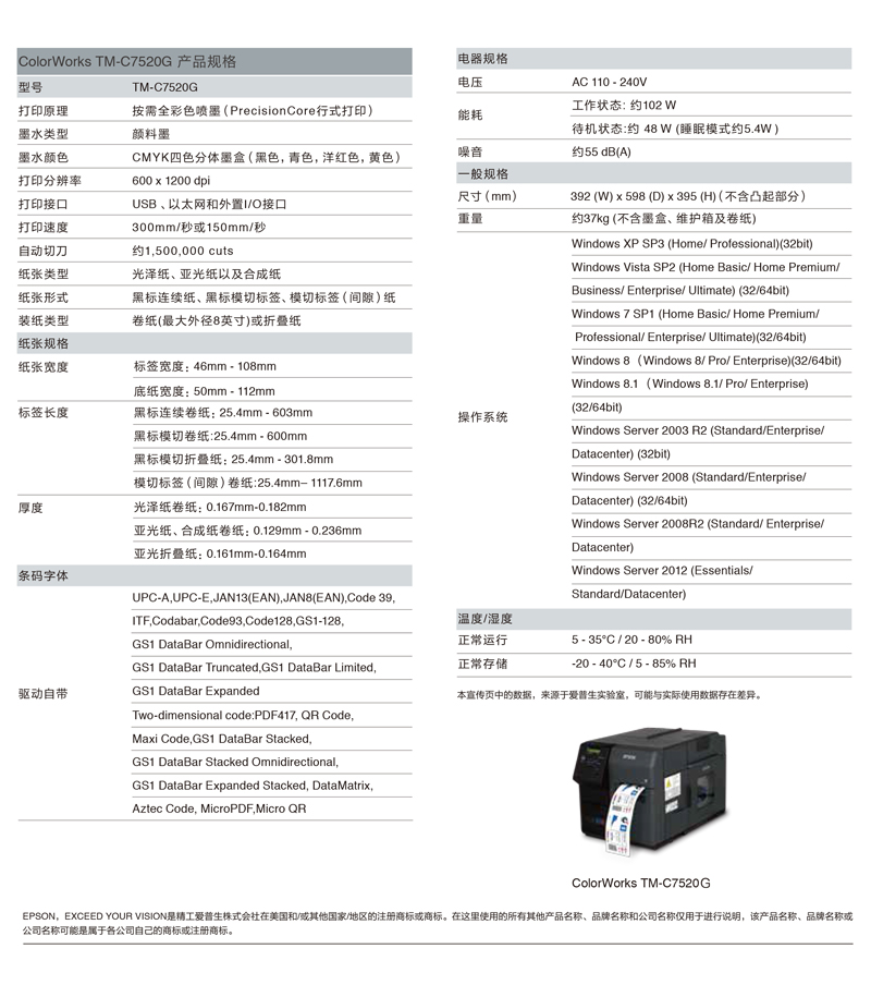 在彩色標(biāo)簽打印領(lǐng)域,TM-C7520G是使用愛普生全新PrecisionCoreTM 行式打印技術(shù)的新一代全彩色標(biāo)簽打印機(jī)?;趷燮丈赜械腅SC/Label 指令語言,替代了預(yù)印刷彩色套打可變信息的傳統(tǒng)模式,實(shí)現(xiàn)超高速高質(zhì)量 的彩色標(biāo)簽按需打印!產(chǎn)品功能介紹:超高速度:全新Precision Core 行式打印頭,實(shí)現(xiàn) 300mm/s 超高速輸出,彩色標(biāo)簽可